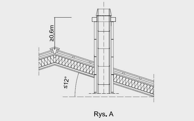 - przy dachach płaskich o kącie nachylenia połaci dachowej nie większym niż 12o, niezależnie od konstrukcji dachu, wyloty przewodów powinny znajdować się co najmniej o 0,6 m powyżej poziomu kalenicy lub obrzeży budynku przy dachach wgłębionych - rys. A.