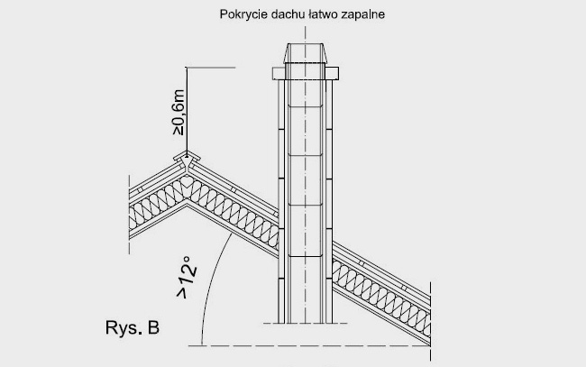 – łatwo zapalnym, wyloty przewodów powinny znajdować się na wysokości co najmniej o 0,6 m wyżej od poziomu kalenicy - rys. B.