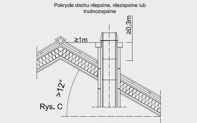 – niepalnym, niezapalnym i trudno zapalnym, wyloty przewodów powinny się znajdować co najmniej o 0,30 m wyżej od powierzchni dachu oraz w odległości mierzonej w kierunku poziomym od tej powierzchni co najmniej 1,0 m - rys. C.