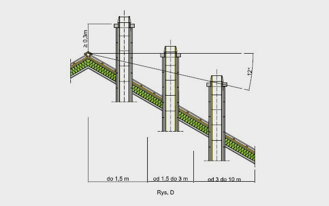 przy usytuowaniu komina obok elementu budynku stanowiącego przeszkodę (zasłonę) - przy czym dach o nachyleniu połaci dachowej ponad 12o należy uważać za przeszkodę - dla prawidłowego działania przewodów ich wyloty powinny znajdować się: