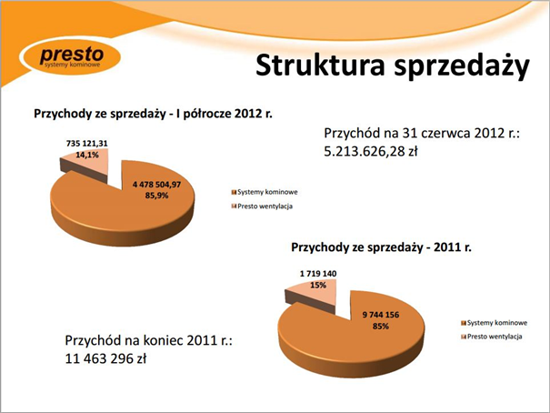 Rozpoczęto od omówienia prezentacji, w której opisano strukturę sprzedaży, historię rozwoju Spółki, asortyment wraz z nowymi produktami, a także przewagi konkurencyjne. Podkreślano „bardzo dobrą jakość przy rozsądnych cenach” oraz uniwersalność oferowanych produktów – zarówno systemy kominowe Presto, jak i systemy uszczelniania przewodów kominowych są kompatybilne ze wszystkimi dostępnymi na rynku urządzeniami grzewczymi, bez względu na ich wielkość czy rodzaj paliwa.