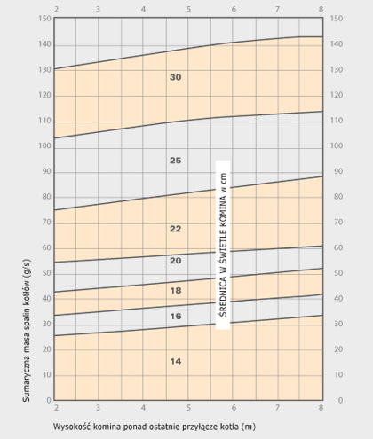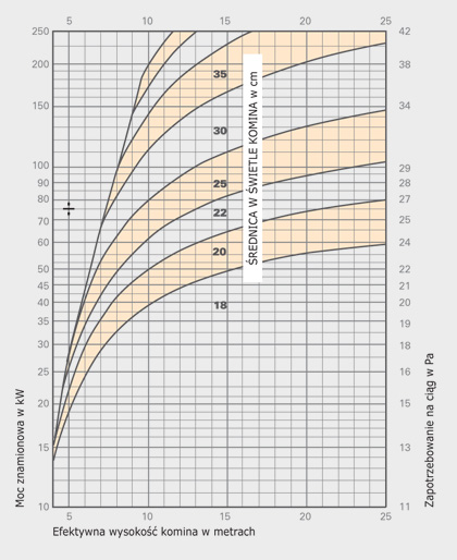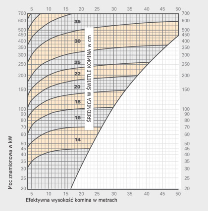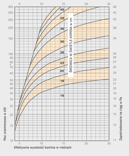 Poniżej zamieszczone diagramy umożliwiają dobór średnicy komina w zależności od typu kotła, jego mocy znamionowej oraz efektywnej wysokości komina. Prawidłowo określona średnica komina do współpracującego kotła (paleniska) jest warunkiem jego prawidłowej pracy.